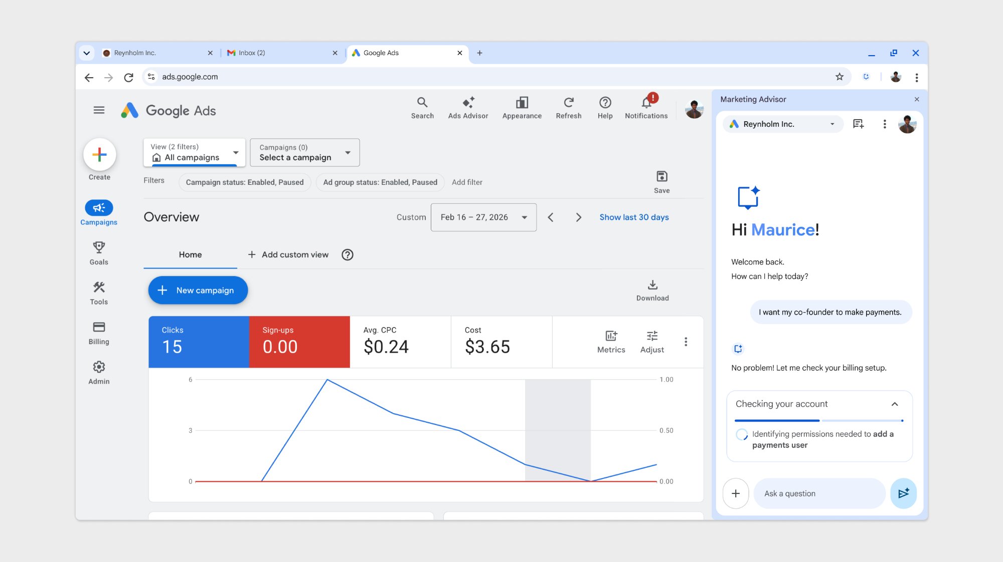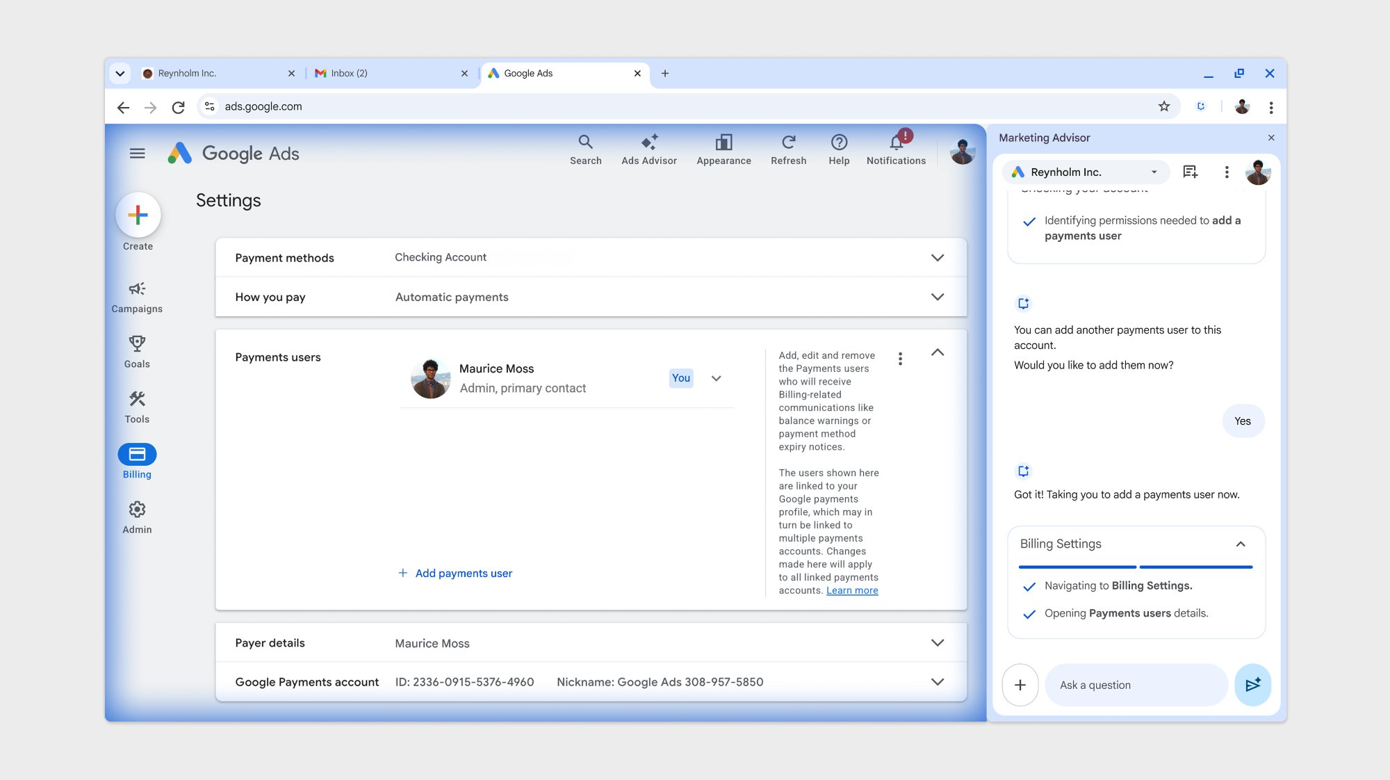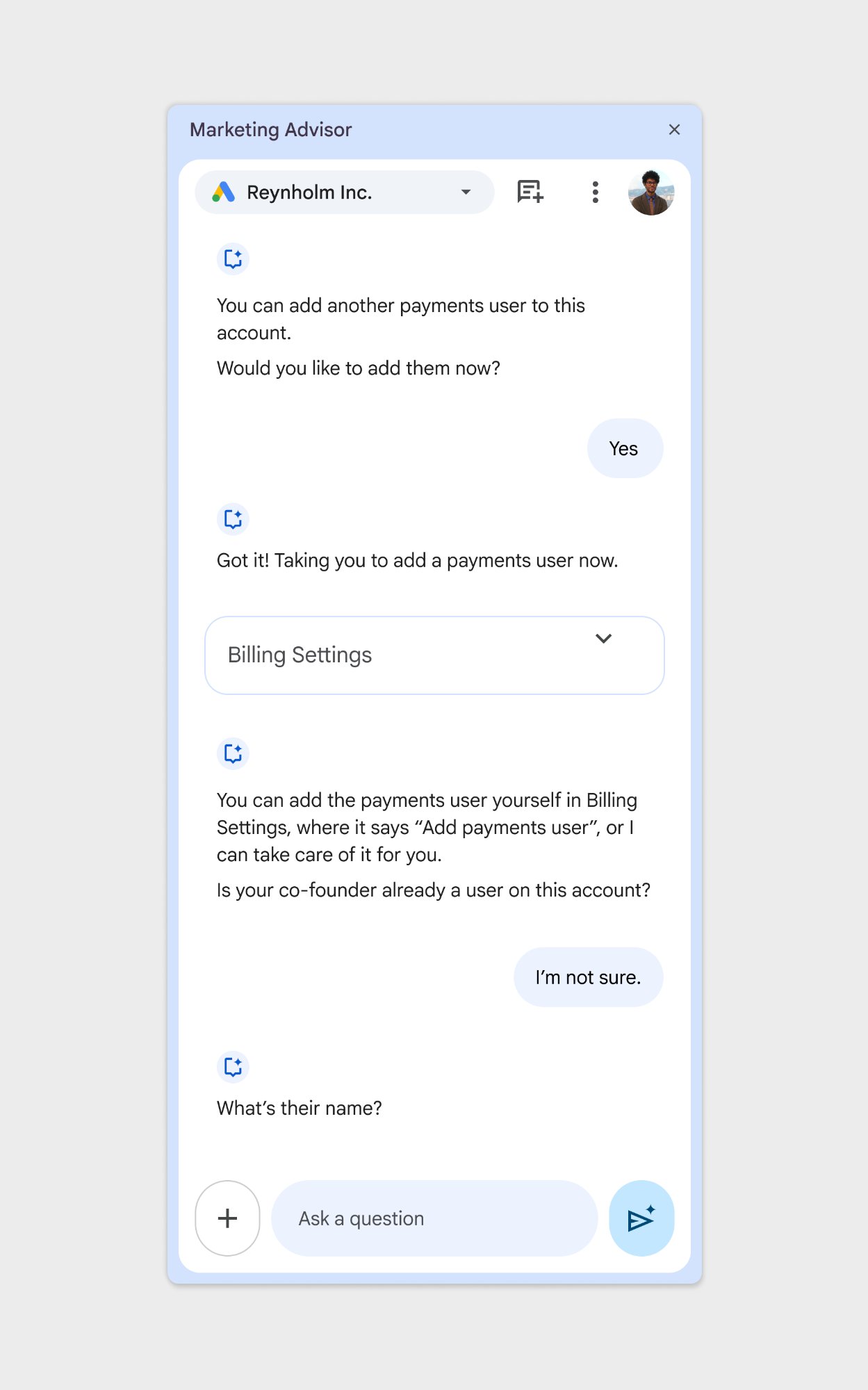 As part of a larger UX team, I designed Google Marketing Advisor, an agentic AI tool that autonomously diagnoses and resolves customer issues, replacing the traditional call center model and reducing time-to-resolution.